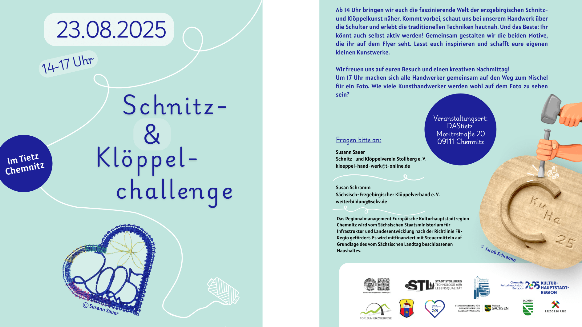 ![]() Die Kommunen der Kulturhauptstadtregion Chemnitz 2025 bekommen die Möglichkeit, sich im Regionalschaufenster im Tietz in Chemnitz zu präsentieren. Heute hat die Große Kreisstadt Stollberg ein buntes Mitmachprogramm mitgebracht. Weitere Infos: Susan Schramm Sächsisch-Erzgebirgischer Klöppelverband e. V. weiterbildung@sekv.de Susann Sauer Schnitz- und Klöppelverein Stollberg e. V. kloeppel-handwerk@t-online.de |